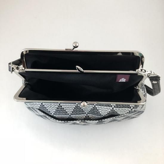 柔道着や剣道着にも使われる刺子織生地で作られたシリーズ。開口部の口金が3枚になっている仕切りタイプの便利な形。紐は取り外しが可能です。